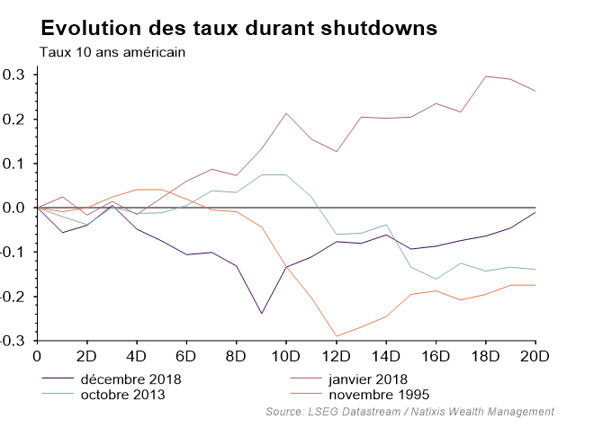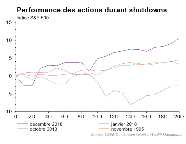 - Les marchés doivent-ils s’inquiéter ? Historiquement, les marchés sont peu perturbés par ces épisodes d’incertitude. La performance moyenne dans le mois qui suit le début d’un shutdown s’établit autour de +4%. L’incertitude semble plus se refléter au travers des taux d’intérêt qui ont tendance à abandonner quelques points de base en raison d’une économie qui fonctionne au ralenti pendant quelques jours.