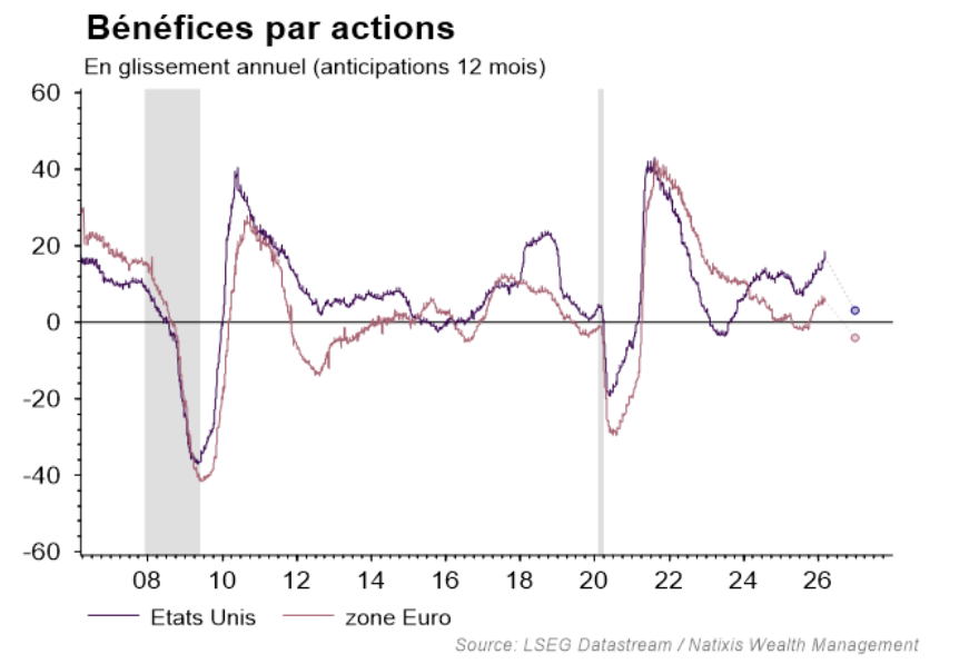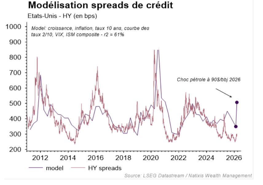 Un impact potentiel important sur les profits. Le scénario d’un choc passager mais suffisamment important pour entraîner un baril de pétrole autour de 90$ en moyenne en 2026 conduirait à une révision significative des profits attendus par les analystes*. Avec une croissance américaine revue à 1,8% (vs 2,2% attendu par le consensus) les profits tomberaient à +3% (vs +15%). En zone Euro, un choc pétrolier équivalent reviendrait à supprimer une bonne partie de la croissance du PIB qui atteindrait +0,4% (vs +1,2%), conduisant à un repli des profits de l’ordre de -4% (vs +9% dans le consensus). Un tel scénario implique encore un potentiel de baisse d’un peu moins de 10% sur les indices. Du côté du crédit, le potentiel d’écartement des spreads de crédit HY apparait nettement plus important aux Etats-Unis.