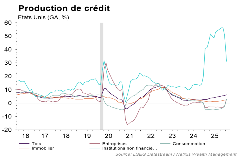 Un air de déjà-vu. Les derniers jours ont de nouveau fait état de difficultés à honorer les rachats dans l’industrie de la dette privée, ravivant des souvenirs désagréables pour les marchés. Après Blackstone, des fonds de Morgan Stanley et Cliffwater ont également annoncé faire face à des demandes de rachats significatives, entraînant le déclenchement de quotas de sorties. Ces signes de stress des investisseurs face à une classe d’actifs pourtant très performante ces dernières années illustrent la dégradation du sentiment de marché sur le crédit. Cette situation est renforcée par les récents évènements qui créent des tensions sur les taux d’intérêt. Néanmoins, d’après le Financial Times, les fonds sont parvenus jusqu’à présent à honorer la grande majorité des demandes de sorties (70%). Cependant, la persistance du conflit au Proche-Orient accentue la pression et pourrait rejaillir de façon inattendue sur le secteur bancaire. En effet, loin d’être isolée des circuits bancaires classiques, l’industrie de la dette privée a formé une source importante de progression des encours de crédit bancaires. La croissance des prêts aux institutions non financières aux Etats-Unis ces dernières années (Non Depositary Institutions – NDI, qui regroupe notamment les prêts aux sociétés de private debt) témoigne de l’engouement du secteur bancaire pour le financement de cette activité. Si la désaffection pour cette classe d’actifs venait à s’accentuer sensiblement, le secteur bancaire n’en serait pas épargné. Deutsche Bank a d’ailleurs vu son cours souffrir cette semaine après l’annonce d’une exposition de 26Md$ au secteur des fonds de dette privée, et JP Morgan a annoncé réduire son activité de prêt aux acteurs de la dette à destination des entreprises de logiciels…